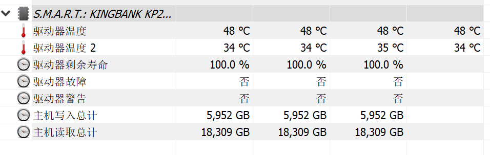 金百达KP260 Plus默认拥有两个温度传感器,在室温29℃时,未安装散热片的情况下,待机温度表现大致如下图所示
