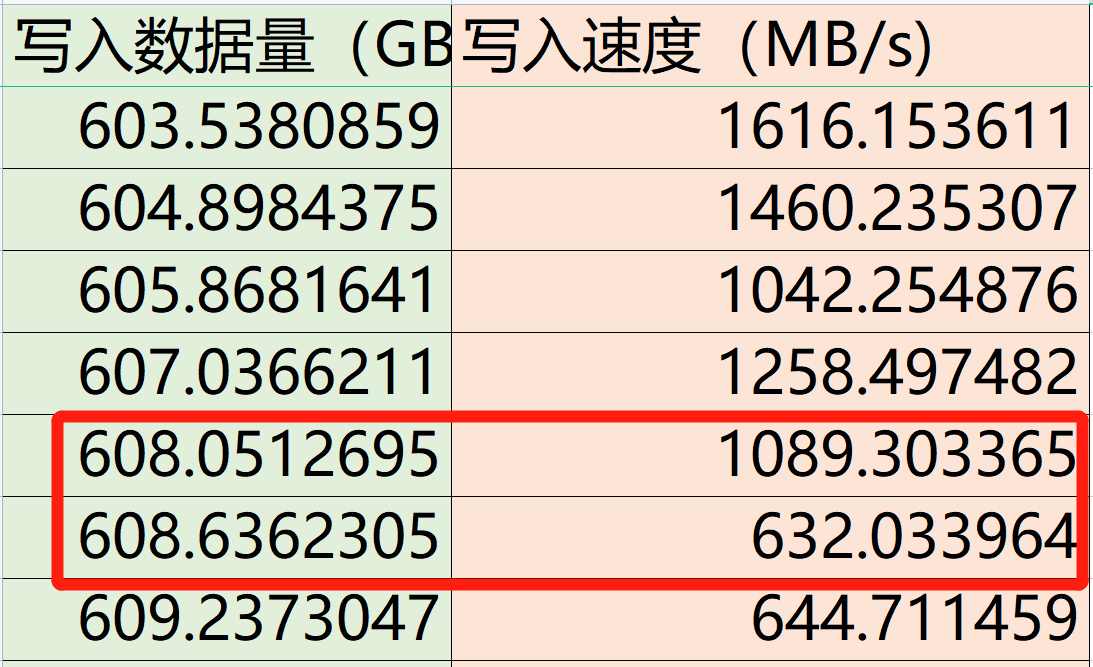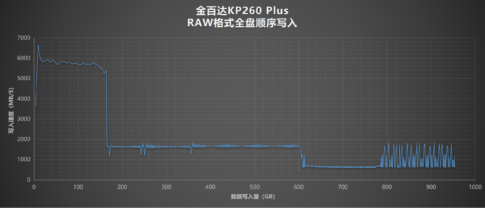 在写入606G左右时,进入了最后一段最慢的垃圾回收阶段。此时主控又要忙着释放先前写入的SLC缓存空间,又要同时兼顾写入,速度降下来是正常情况。在这一段曲线中,金百达KP260 Plus的写入速度依然能维持在600MB/s以上,也是相当出色的成绩了。