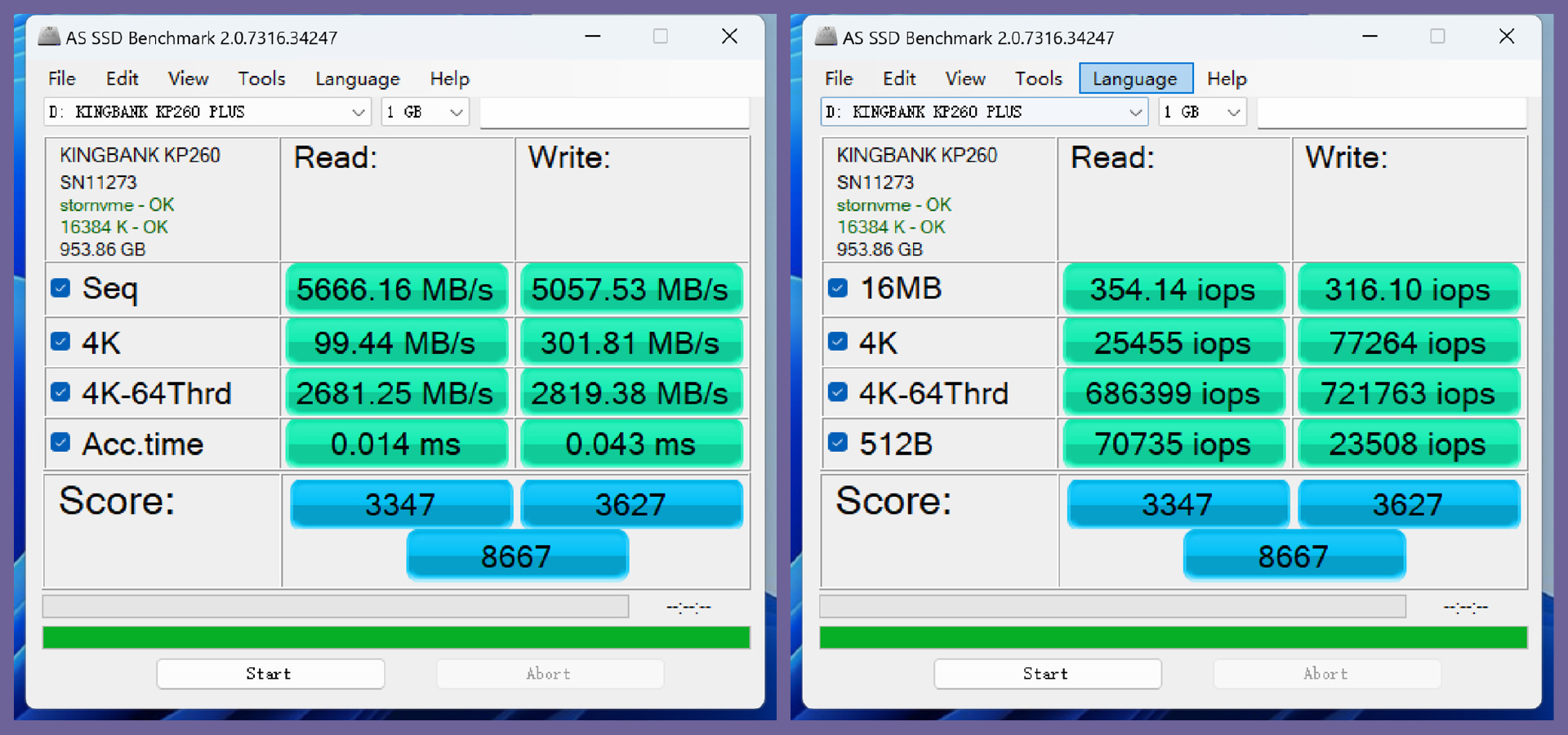 空盘状态下,金百达KP260 Plus的顺序读取速度为5666MB/S,顺序写入速度为5057MB/s,得分8667分。同时缓内Q1T1 4K随机读取速度为99.44MB/s,比CDM的测试结果还要好。