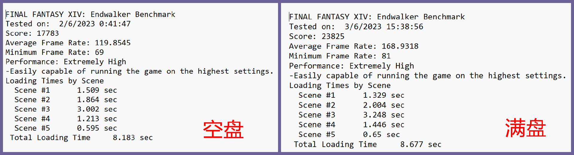 为了验证这个说法,这里使用最终幻想14的Benchmark测试程序,分别对金百达KP260 Plus的空盘和95%占用下两种情景进行了载入时间测试。
