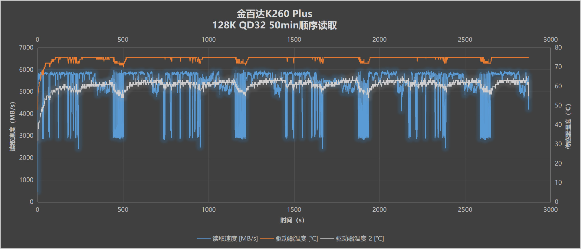 为了探究金百达KP260 Plus在长时间高负载下的温度表现,选择对其进行45分钟的128K QD32顺序读取压力测试,并同时记录读取速度与温度表现,生成了以下图表: