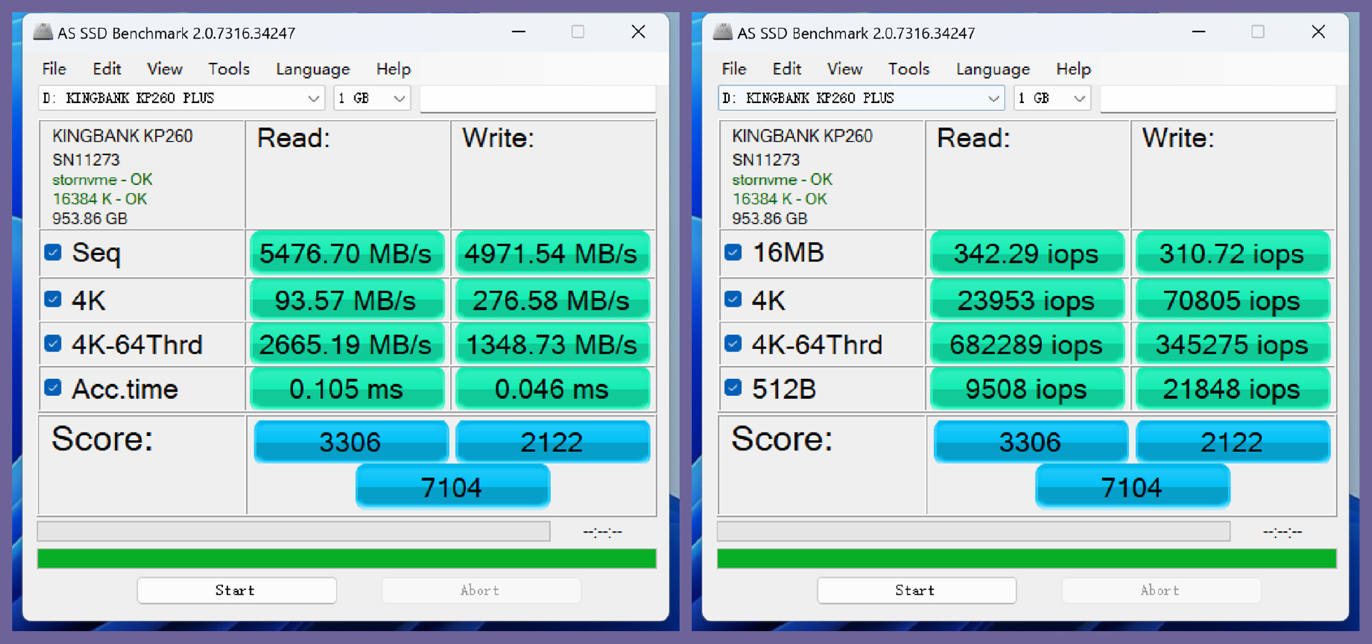 95%满盘状态下,金百达KP260 Plus的顺序读取速度为5476MB/S,顺序写入速度为4971MB/s,得分7104分,性能也几乎和空盘状态下持平。