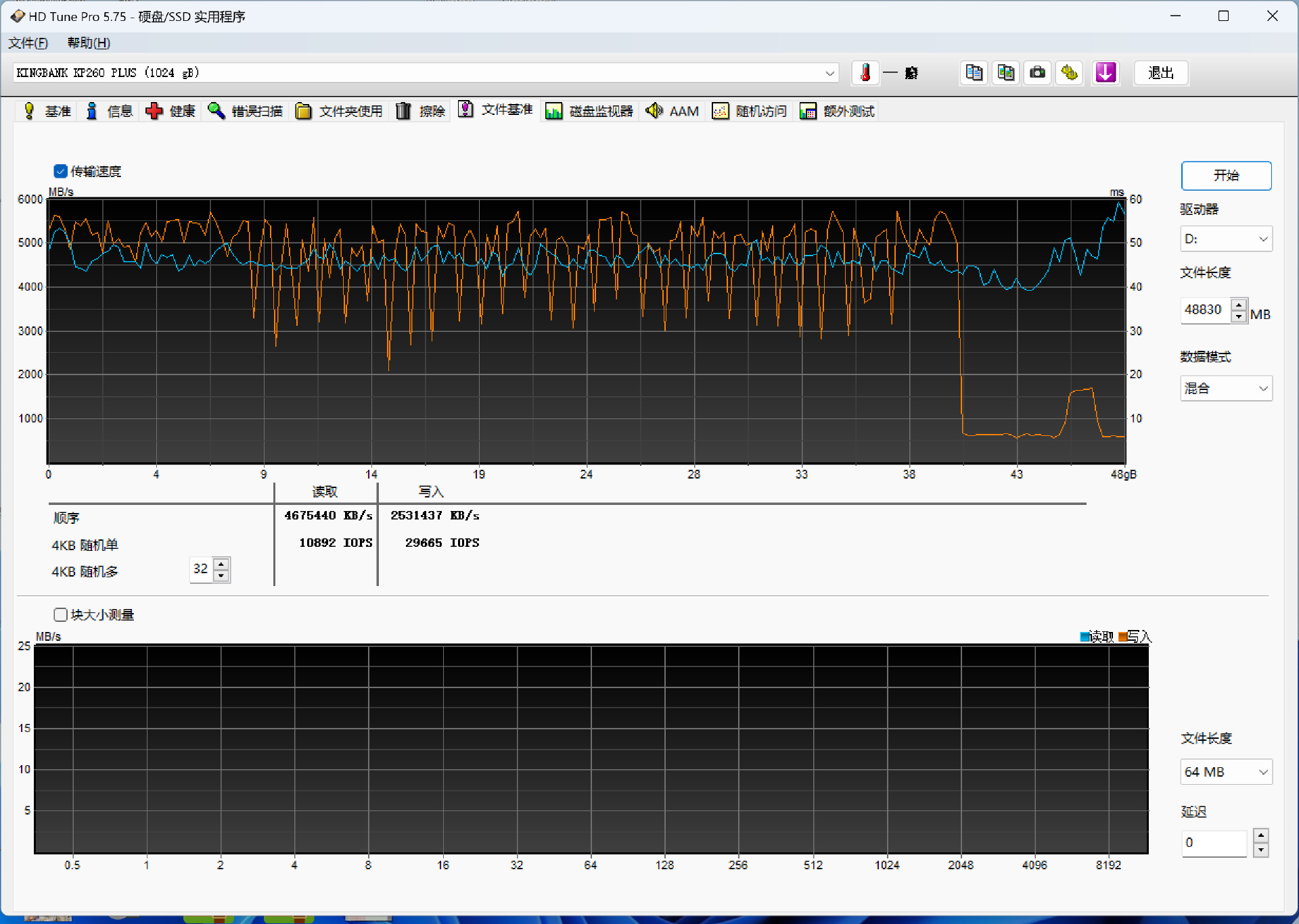空盘状态下,金百达KP260 Plus的顺序读取速度为7111.69MB/s,顺序写入速度为6547MB/s,均超过了官方标称的性能参数。