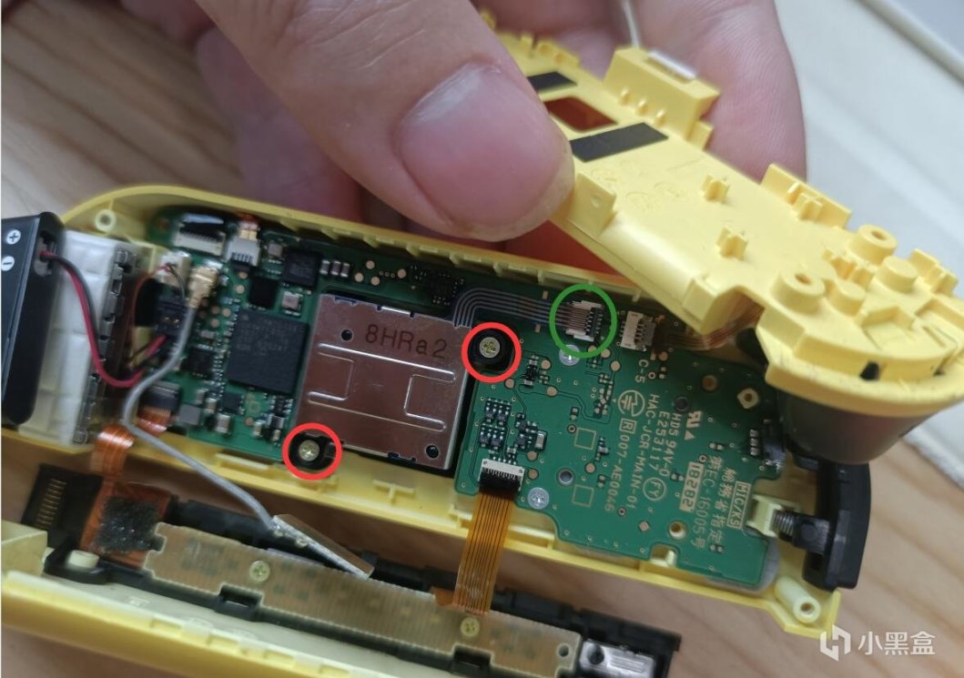 4.然后摇杆模块就露出来了。绿圈那里有个卡扣,用镊子拨开,然后拔出排线。