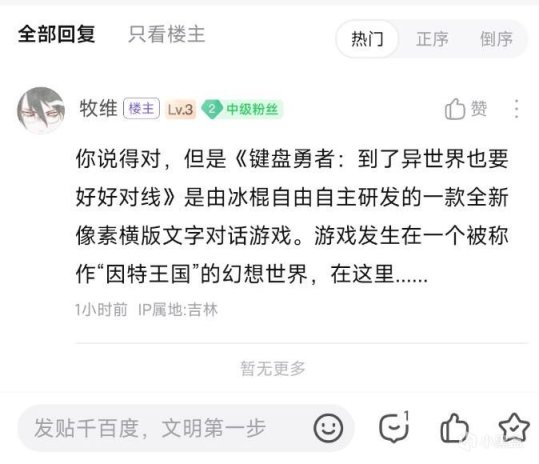 结合我以上的经历,以及对现在乌烟瘴气的互联网环境,写了个关于键盘侠穿越到互联网的异世界打魔王的故事。必须承认,这个故事带有强烈的自我投射,大量的neta和致敬,对玩家的二次元和网络浓度有一定要求,否则get不到其中的点。