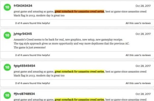 2017年,《刺客信條:起源》就在 Metacritic 出現了大量水軍刷的好評。
