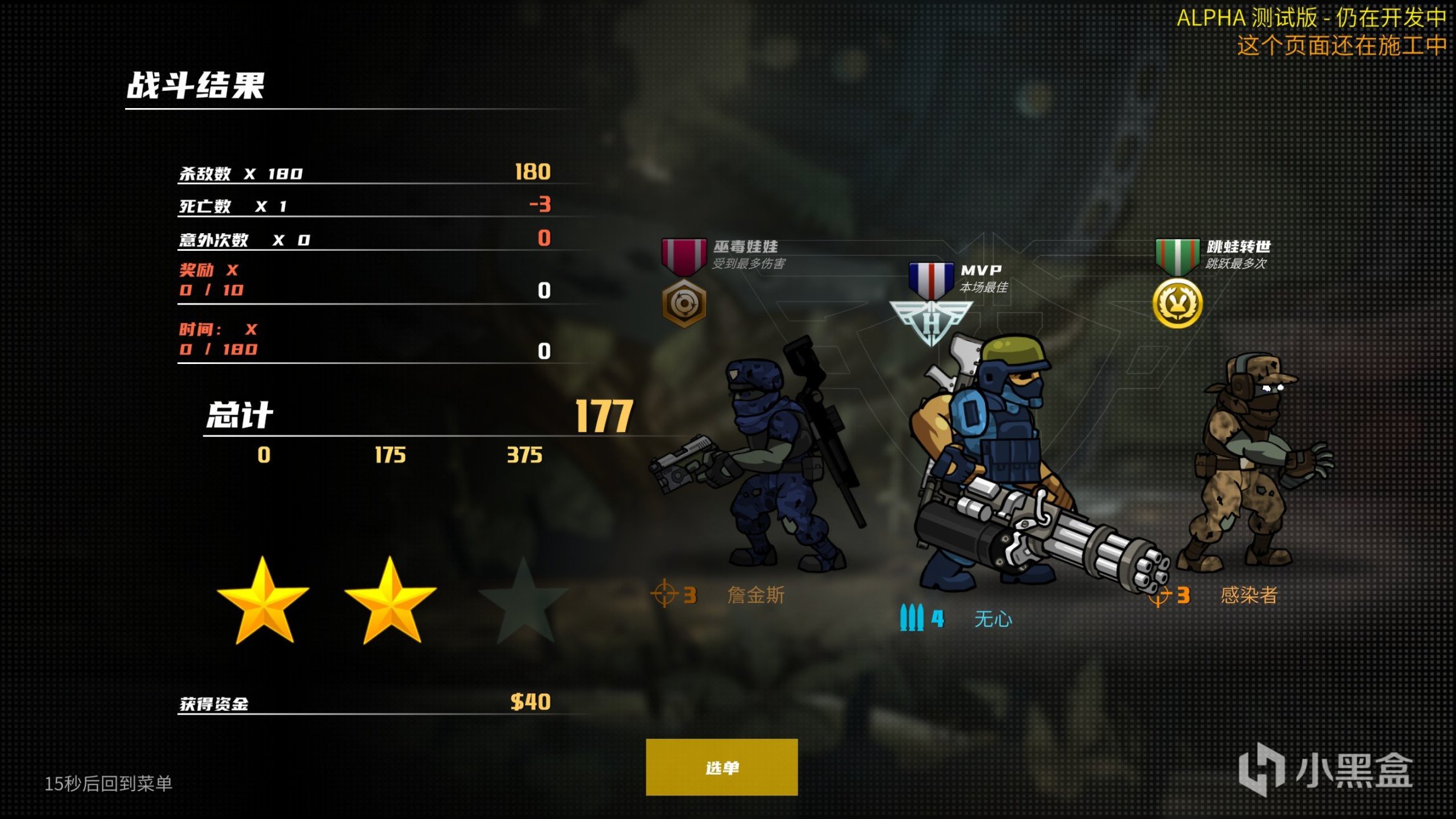 需要注意的是,战斗胜利的时候,在跳出击杀数量等结算界面的时候,地方还是会复活并攻击的,在这段时间死亡的话,依然算在死亡次数里,会影响获得三星结算成绩获得稀有奖励的。另外,游戏怎么获得3星结算没有提示,这点在后面应该会更新才对。