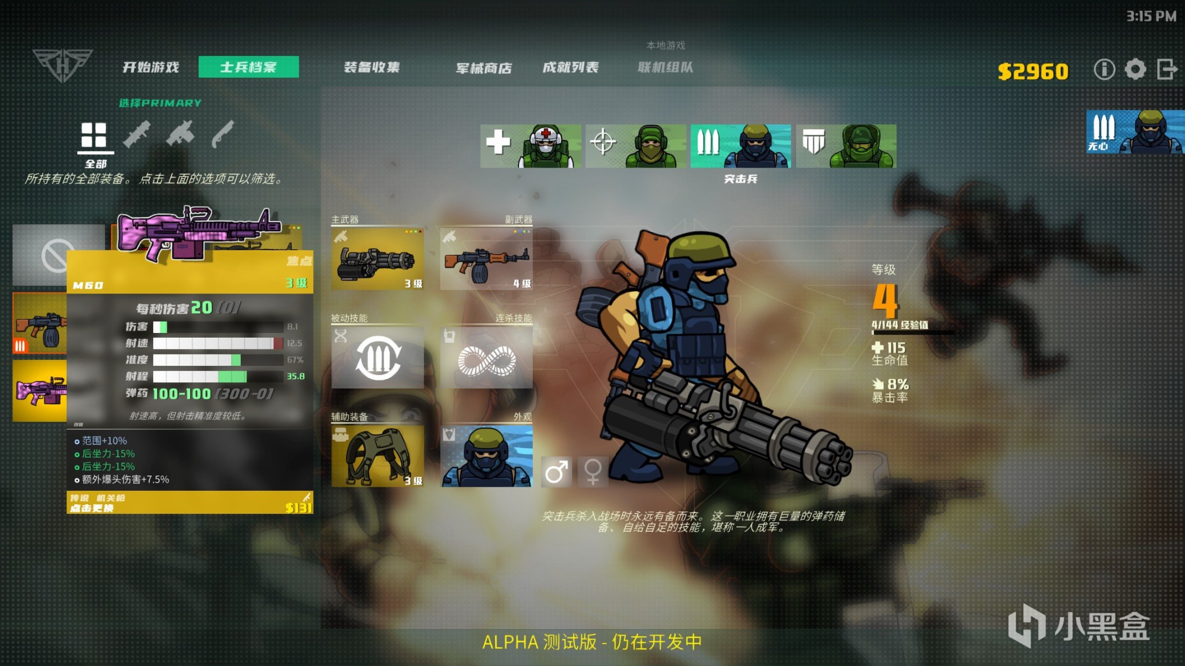 游戏提供有4个兵种,分别是医疗兵(可以拿AK枪械)、狙击手、突击兵、坦克兵(带有盾牌血厚,不过只能拿手枪了),四大兵种各有用处,能使用的枪械有所不同之外,所拥有的的技能也各不相同。并且每次战斗击杀敌人都能获得各自的经验,目前的DOME版本毕竟是试验版本,升级了只能解锁士兵的被动技能和连杀技能,并没有增加角色属性。