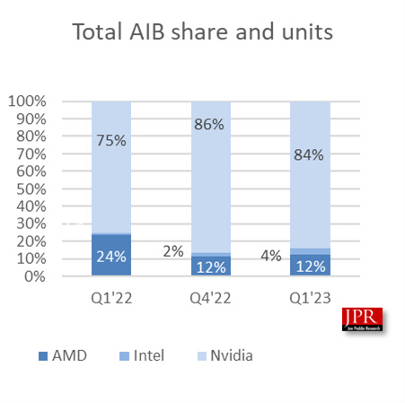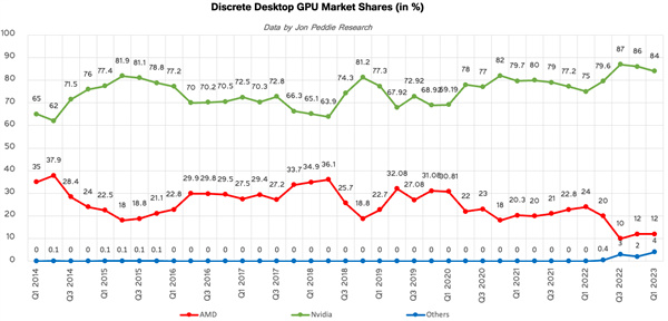 市場份額方面,NVIDIA佔據多達84%,雖然最近三個季度逐漸走低,但依然佔據絕對主導,而且同比高了9個百分點。