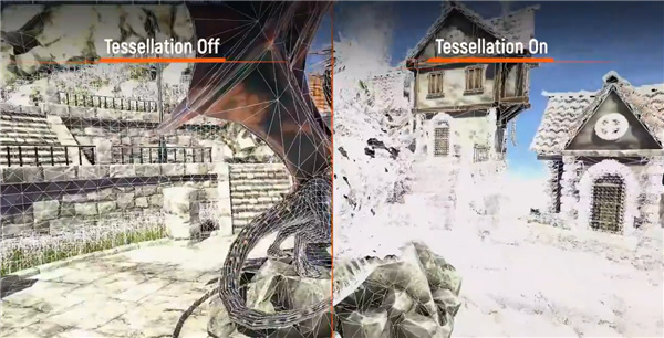 一個場景是利用標準的細分着色器,對地形數據進行實時細分操作,在不增加額外數據量的前提下,渲染出更爲複雜的形狀、表面,模型呈現效果更爲柔和、真實。