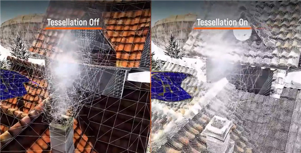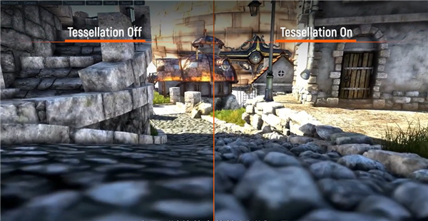 另一個場景是大家非常熟悉的Unigine Heaven,開啓曲面細分後,地面、水面、建築、物體的呈現更加細緻,細節更加豐富,真實感更強。