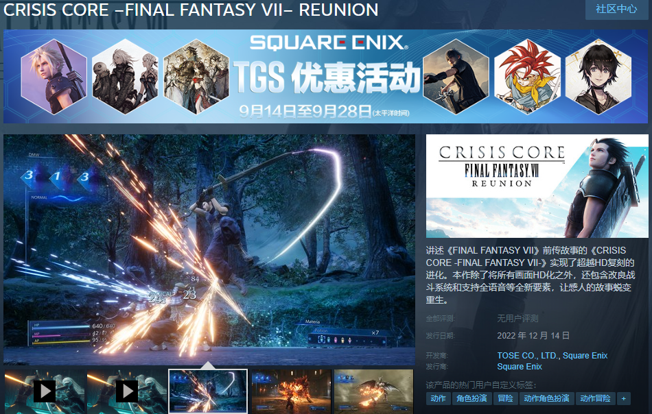 今日(9.15),《最終幻想7》前傳高清復刻版——《最終幻想7 核心危機 重聚》在Steam正式登場(於12月14日正式發售),並開啓了相應預購(Steam平臺遊戲本體298元,豪華版446元)。