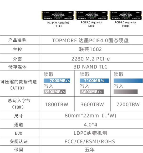 其他方面,達墨這款4TB硬盤也是長江存儲的3D TLC閃存,聯芸1602主控,支持LPDC糾錯,5年質保,數據壽命達到了驚人的7200TBW,規格都非常強大。