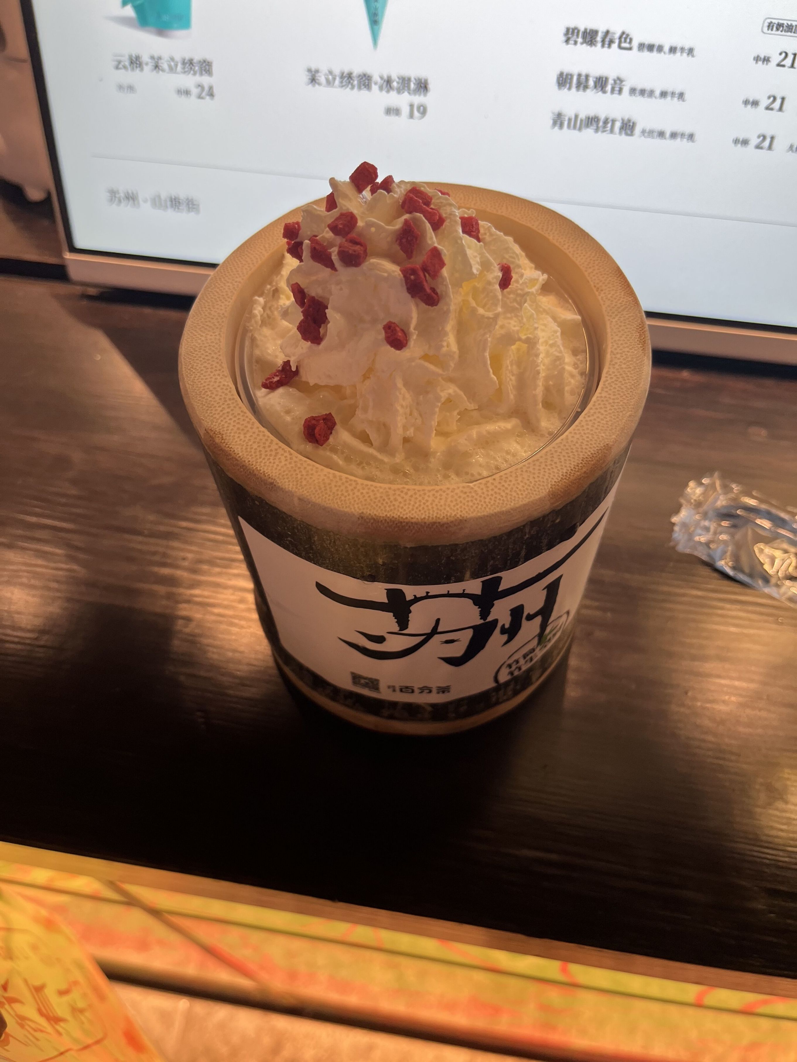 我今年二月去西安玩时,盒友舔舔和其他朋友推荐的地方品牌“茶话弄”给我留下了深刻的印象。因此这次来苏州,我也对特色饮品有所留意。这里我比较推荐各位尝试百分茶的竹筒奶茶冰淇淋(作为容器的竹筒还被我当作纪念品带回上海了)。