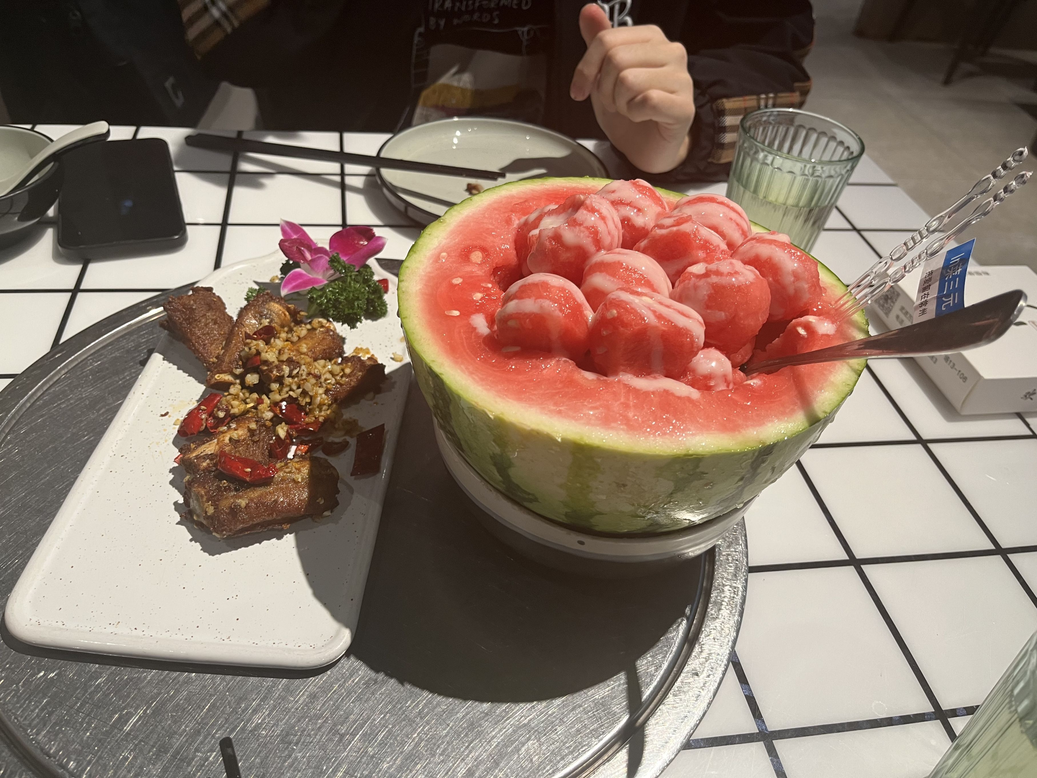 常州的知名美食有天目湖砂锅鱼头、香糟扣肉、寨桥老鹅等。不过富哥室友并没有带我吃这些,而是把我带到了一家名为“菜三元”的餐厅,请我吃了冰淇淋鹅肝粒、“半个西瓜”、咸蛋黄牛蛙、乳山生蚝和萝卜干炒饭(好像只有这个炒饭是常州特色菜)等菜品,味道都很不错。