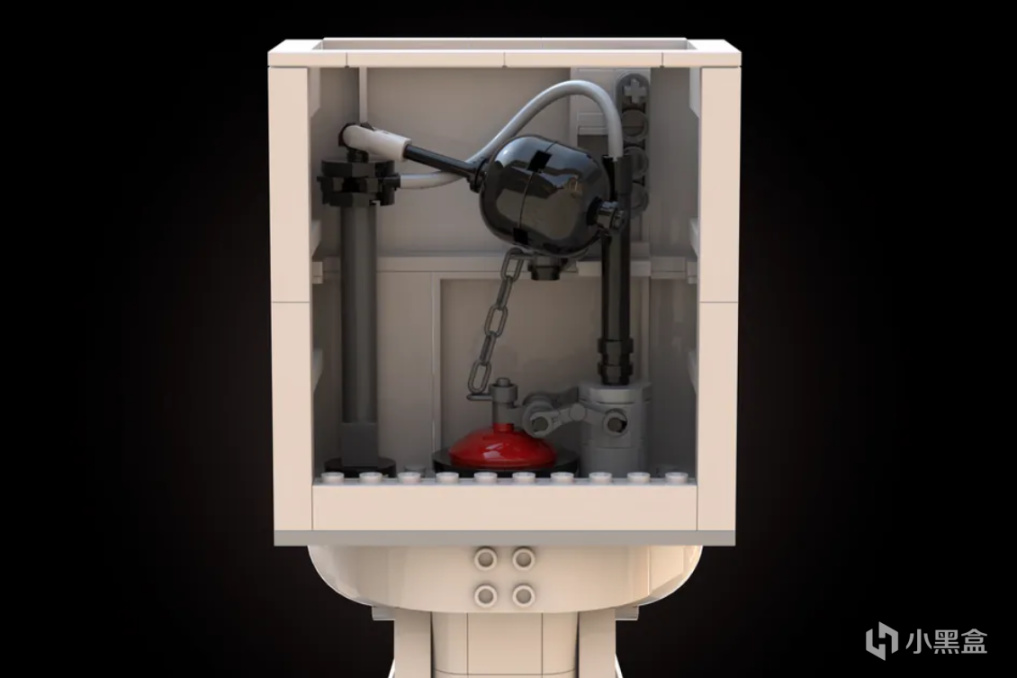 整个马桶水箱部分是有机械可动的部分,可以像正常马桶一样拉开水箱内部的挡板,同时冲水臂、挡板、溢流管和浮球都以乐高形式出现在马桶水箱中。