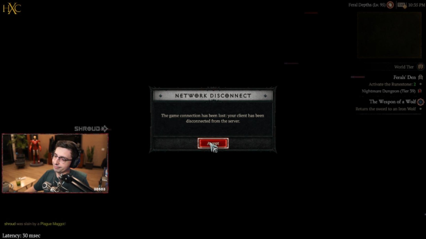 Shroud 當時選擇了德魯伊這個職業,他可以變身爲不同的動物形態,擁有強大的自然魔法和召喚能力,他在遊戲中表現出色,一路殺到了第四幕,但是在一個關鍵的時刻,他遭遇了一個致命的服務器延遲。