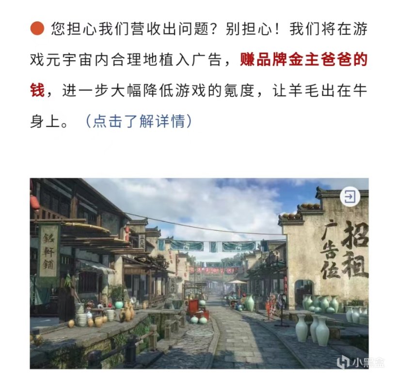 外观、战令月卡和功能性道具,这些虽然都会收费,但不强行逼迫购买。为解决收入问题,《逆水寒》手游首创了元宇宙社区广告模式,能够更多的把成本转移到合作厂商来让利于玩家,这也是他们的底气所在。