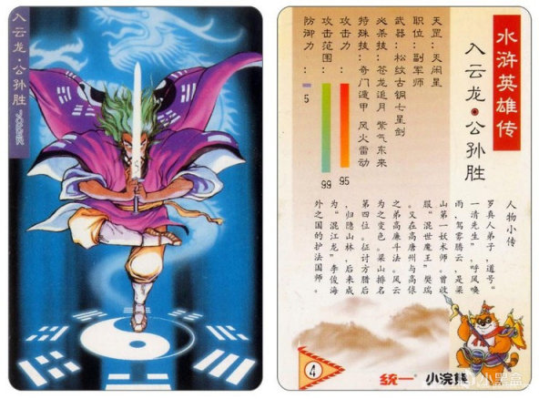 记得那张入云龙公孙胜卡片,是当年我趴在教室外的地板,和玩伴们玩手拍卡片,赢来的。