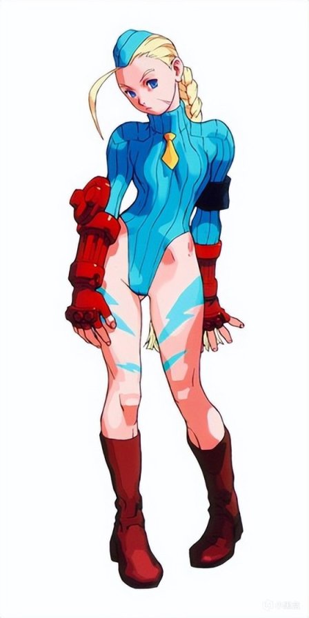 首先,还是让我们先看看嘉米在《超级街头霸王2》中首次登场的造型吧:同样是一张凶狠彪悍但稚气未脱的娃娃脸,同样是身纤细小巧的夸张肌肉和一身标准的军人装束,但这紧身无袖小背心加上迷彩绘制长裤袜看起来好像也就那么回事儿,然而在那个年代这可绝对是个胆大之极激进设计。更何况彼时《街头霸王》系列第一、也是唯一女主的春丽身上已然承载了太多女性格斗家应有的品质,“游戏需要额外女性角色更好地表达性感女人味儿”几乎就成了彼时弥漫在项目组里的某种共识。