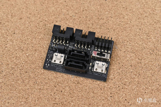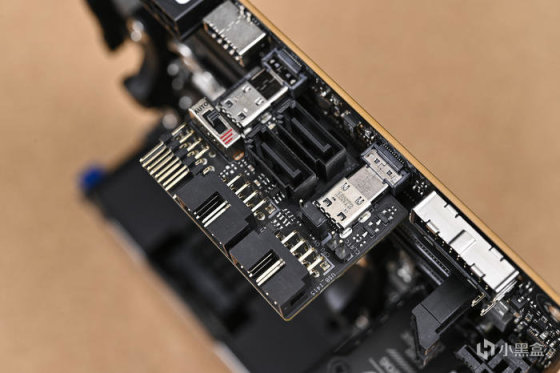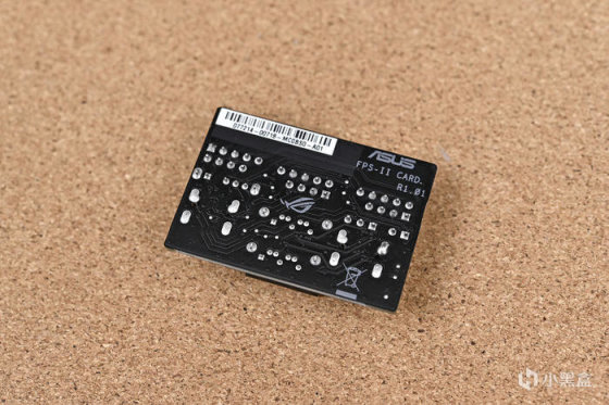 附件中還提供一塊 ROG FPS-II 子卡,主板部分板載接口通過該子卡實現:包含 2 個 SATA 6Gb/s 接口、2 組 USB 2.0 前置接口跳線、完整的機箱跳線接口、1 組溫度探針插口、1 組 CPU OV 跳線、還有一個用於切換 PCIe 5.0 x16 插槽 Gen 模式的三段式物理開關。
