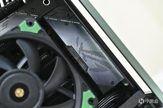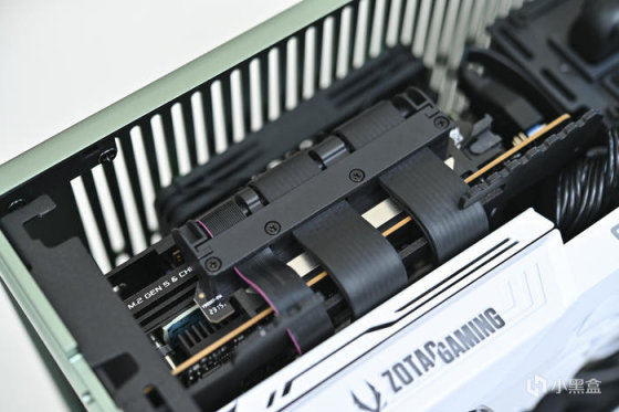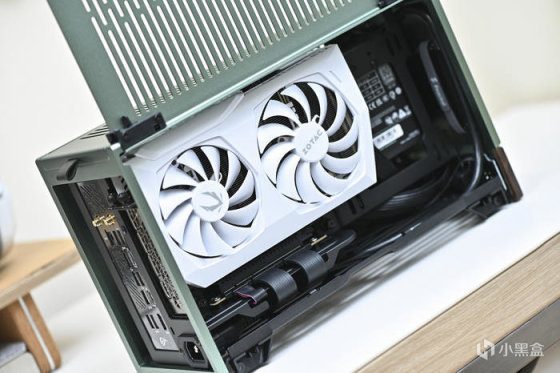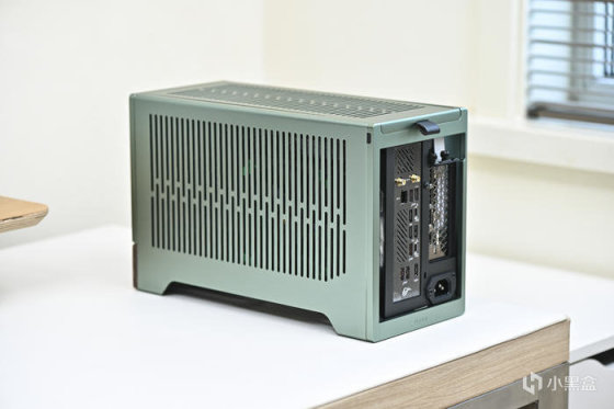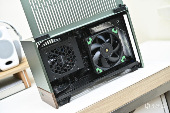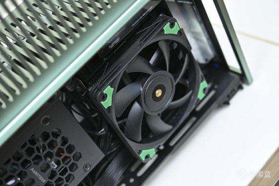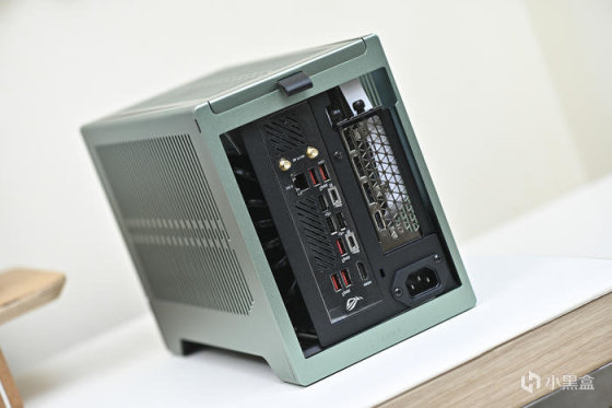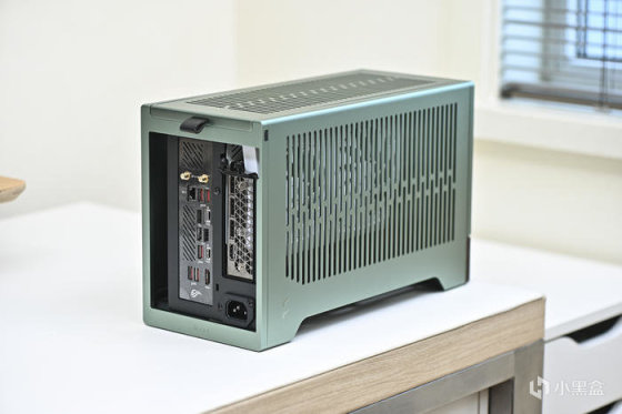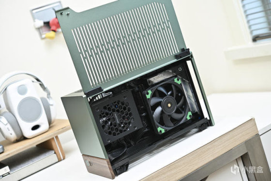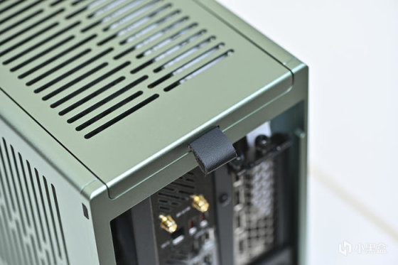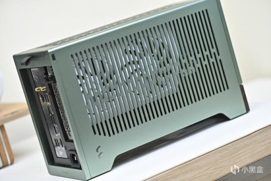 此次帶來 ROG Strix X670E-I+分形工藝 Terra 裝機展示。這是分形工藝 Fractal 最新推出的 A4 Mini-ITX 機箱,黑銀綠三色可選(此次展示綠色),尺寸:343x153x218mm,外鋁內鋼,陽極氧化鋁面板做工細膩,彎折工藝一流,兩側板上翻蓋設計非常炫酷和便捷。主板支持 Mini-ITX,支持 SFX/SFX-L 電源(最大 130mm),顯卡長度最大支持 322mm。這款機箱中板共有 7 個檔位可調節,通過調節中板達到不同高度下壓式散熱和不同厚度的顯卡支持,下壓式散熱支持範圍:48-77mm,顯卡厚度支持範圍:43-72mm。同時這款機箱還支持 120mm 水冷安裝,具備 2 個 2.5 寸硬盤安裝位拓展存儲。值得一提的是,標配高品質 PCIe 4.0 顯卡延長線主板接口做了預製弧度避免對顯卡接口造成拉扯。