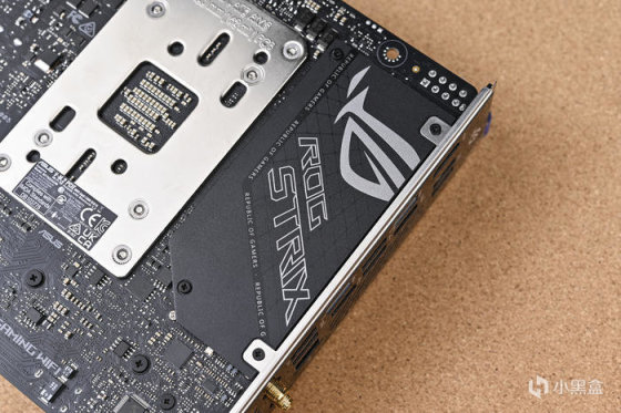 供電以及散熱模塊採用了一字型設計,I/O上蓋與散熱模組實際爲分離式設計,在表面覆蓋有銀灰漸變色的點陣裝飾片,波浪紋的視覺設計效果,上面印有 ROG 鐳雕 Logo,ROG Logo 處的點陣更爲粗大,其作用主要是作爲其 VRM 風扇的輔助進風,並充當裝飾。