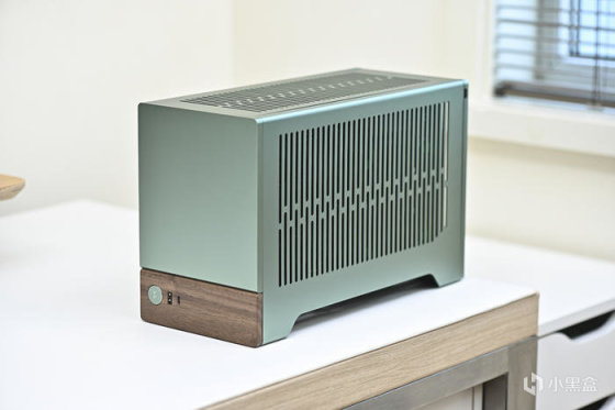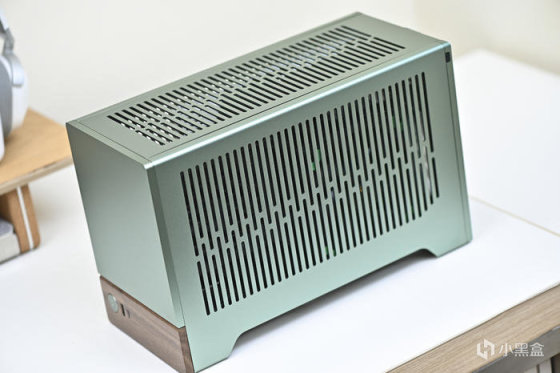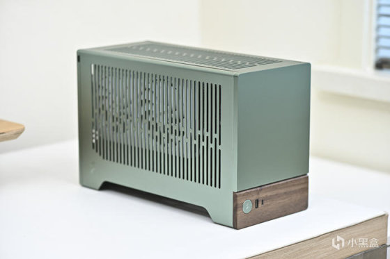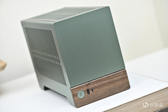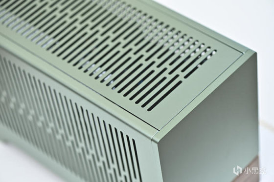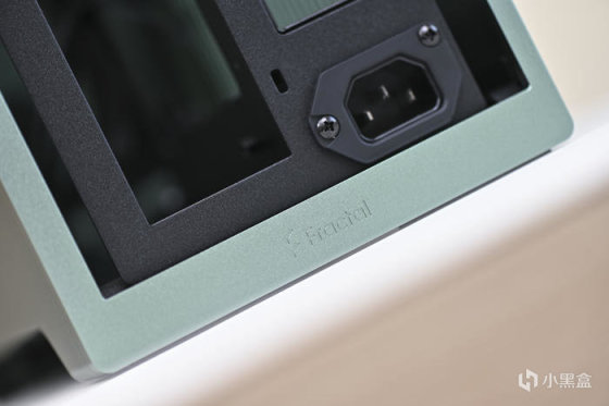 整機綠色調,無光。以下爲機箱各角度展示。分形工藝這個綠色是飽和度比較低的綠,類似綠豆沙的顏色,而且不同光線強度和色溫下顏色會呈現深淺不同的效果。