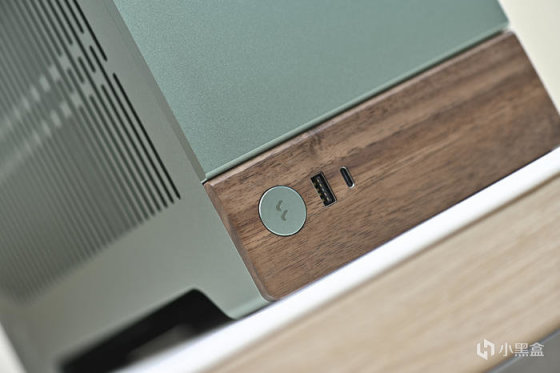 前置 I/O 在胡桃木面板左側,一個和機箱同色的開關機鍵,中央陰刻分形工藝 Logo,非常有質感,右側則是 一個 USB 3.0 TypeA、以及一個 USB 3.2 Gen2x2 TypeC 接口。