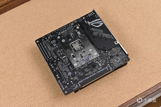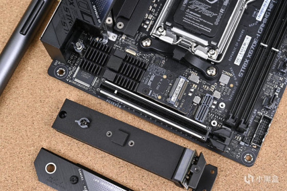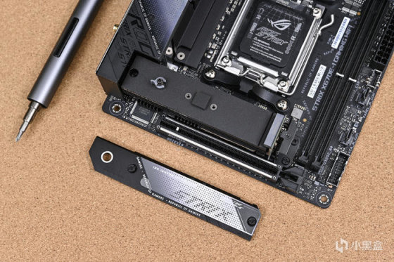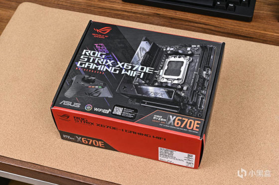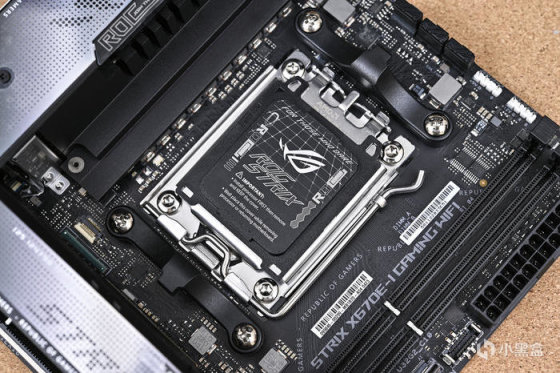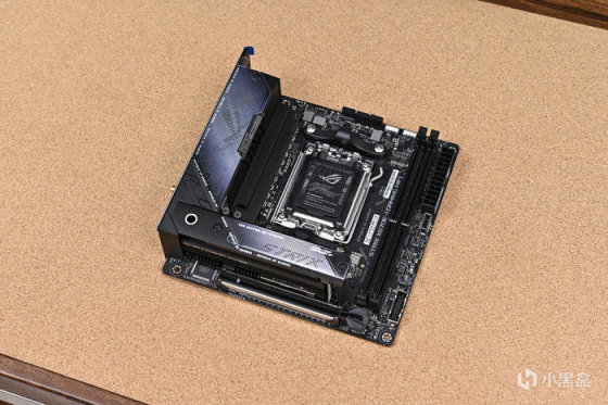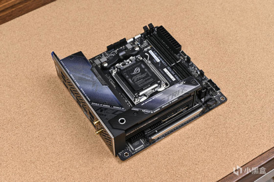 取出主板。ROG Strix X670E-I Gaming WiFi 這是一款 ITX 版型主板,採用黑色主色搭配銀色像素點陣風格。