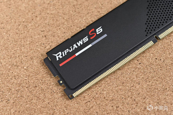 取出內存,內存爲黑色馬甲條,純黑色的 PCB 搭配黑色的散熱馬甲,散熱片採用鋁合金材質,搭配運動潮流造型設計,並巧妙融合賽道風格元素,演繹出 Ripjaws S5 焰刃的動感氣息。無 ARGB 燈效。
