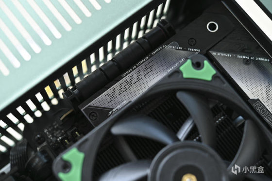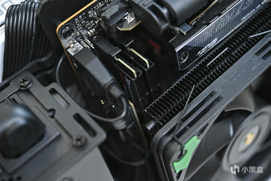 側面設計有一枚半開放式的 VRM 散熱風扇,在其下部設計有深深的開槽用於更好的帶走熱量。