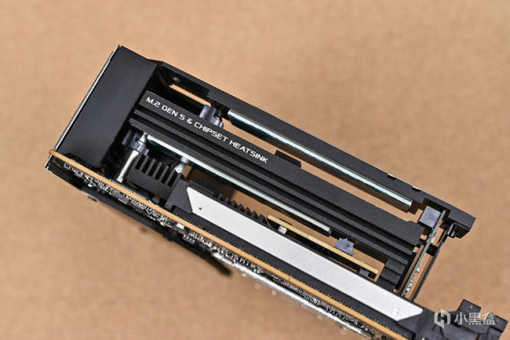 從側面可以看到其下部的立體堆疊式設計,並在中間的散熱片側面設有散熱開槽以及 M.2 Gen5 和芯片組散熱模組的標語。