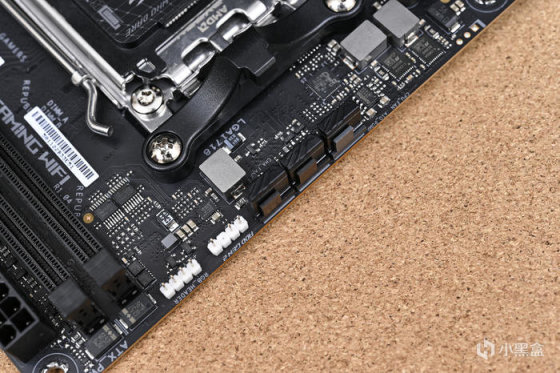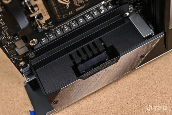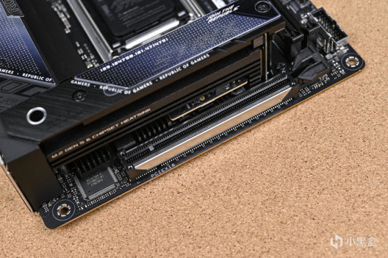 M.2存儲模塊以及芯片組散熱模塊部分,表面散熱片採用金屬拉絲以及漸變點陣裝飾片的拼接風格,在特定角度下同樣可以呈現出波浪紋效果。