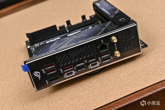 後方I/O接口,包括 1 個 HDMI 2.1、3 個 USB 2.0、5 個 USB 3.2 Gen2、 2 個 USB 4 (兼容核顯輸出)、1 個 2.5Gbps 有線 LAN、 2 個 WiFi 6E 無線網卡雙天線接線端。爲了應對雙芯片組以及未來 PCIe 5.0 M.2 SSD 的龐大發熱,在最後側開孔處安裝一枚風扇用於幫助散熱。
