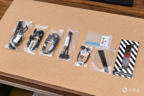 一個座式 WIFI 天線、兩條 SATA 線、一條前置 USB 2.0 一分二線、一條機箱跳線延長線、黑色一次性紮帶,對應數量的 M.2 螺絲以及散熱墊,還有一個 ROG 鑰匙圈。