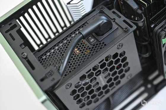 電源尾部通體通風,右側是電源開關及電源接口,開關具備SDP 智能雙重保護技術,智能檢測過流、過載、短路等危害平臺硬件的情況,自動關閉電源保護平臺。電源接口左側是一鍵開啓風扇智能 ECO 開關,採用 Hybird Silent Fan Control 控制技術及 FDB 風扇,滿載運行聲音也非常微小。