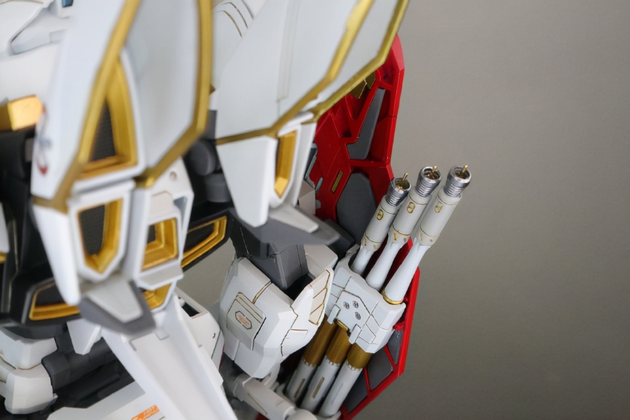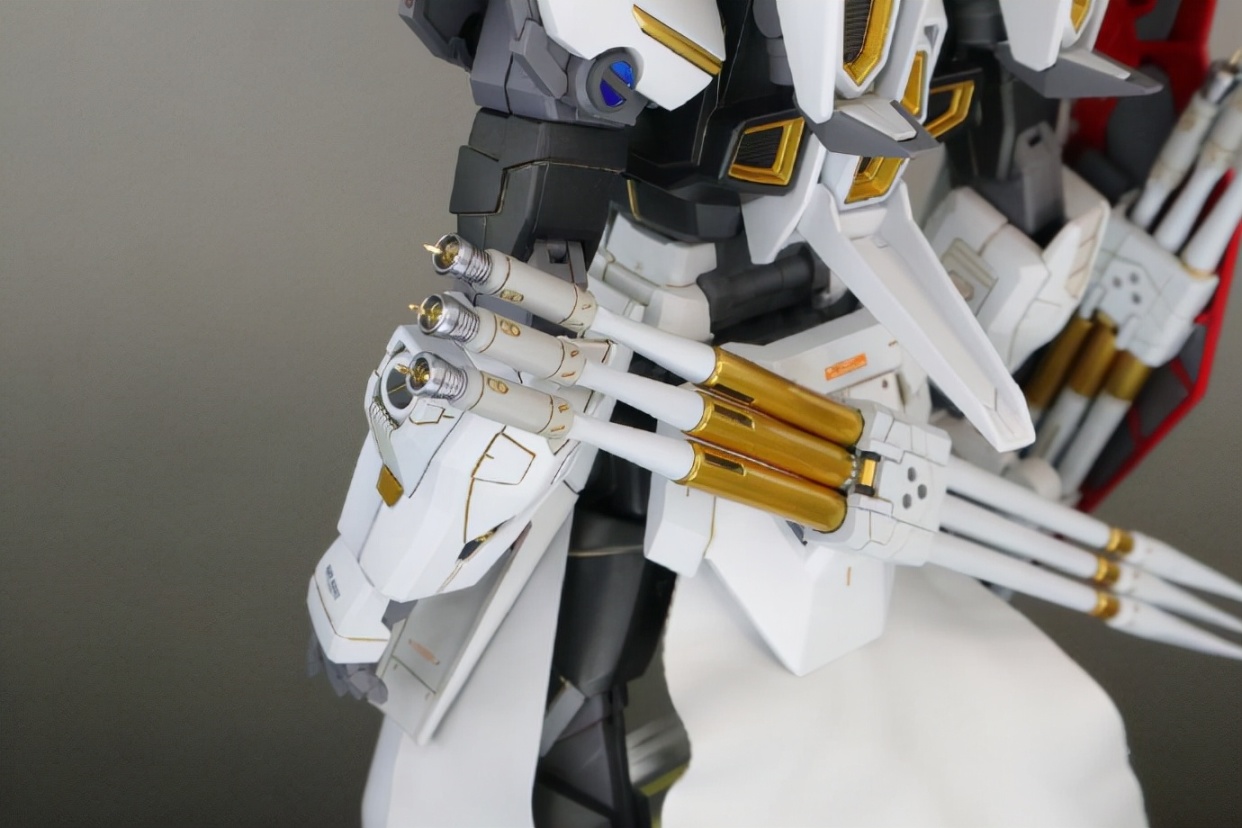 模友为迅雷高达模型增加了很多元素,首先是配色方面进行了大的改造,将原本黑色为主的配色改成了白色为主的配色,细节用金色和红色点缀。为了丰富外甲的细节增加了很多水贴细节,整体模型看起来细节满满质感十足!
