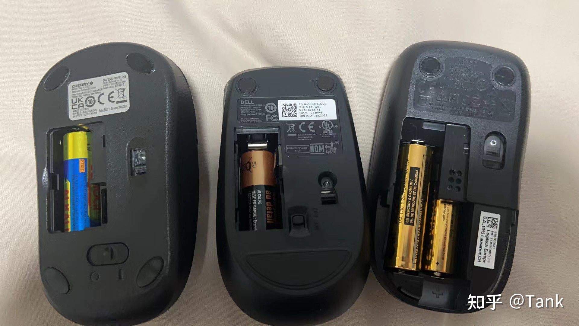 电池供电方面,Cherry 和戴尔都是一节5号干电池供电,而罗技是两节5号干电池供电,所以罗技肯定相比于其他两款鼠标要重一些的,有点不太符合办公场景。
