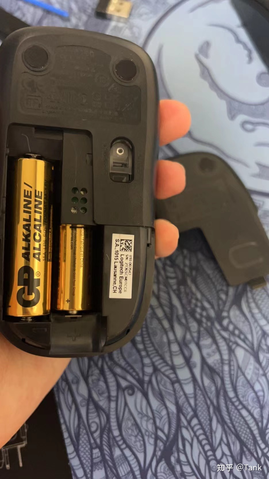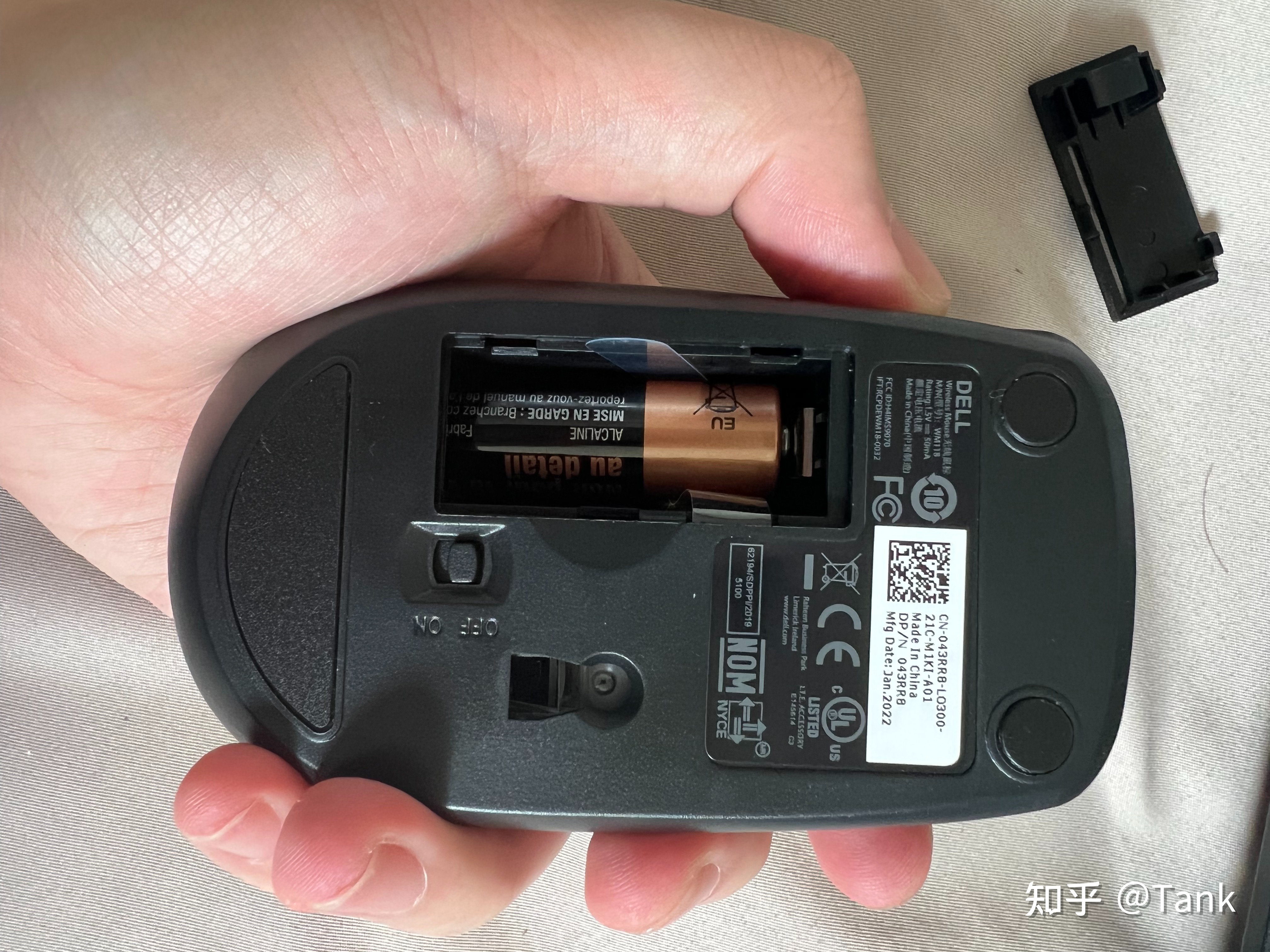 鼠标是单个五号电池的,因为电池仓裸露出来的长度要比电池短一些,所以有一个塑料纸卡在电池下面,方便换电池的时候把电池取下来。