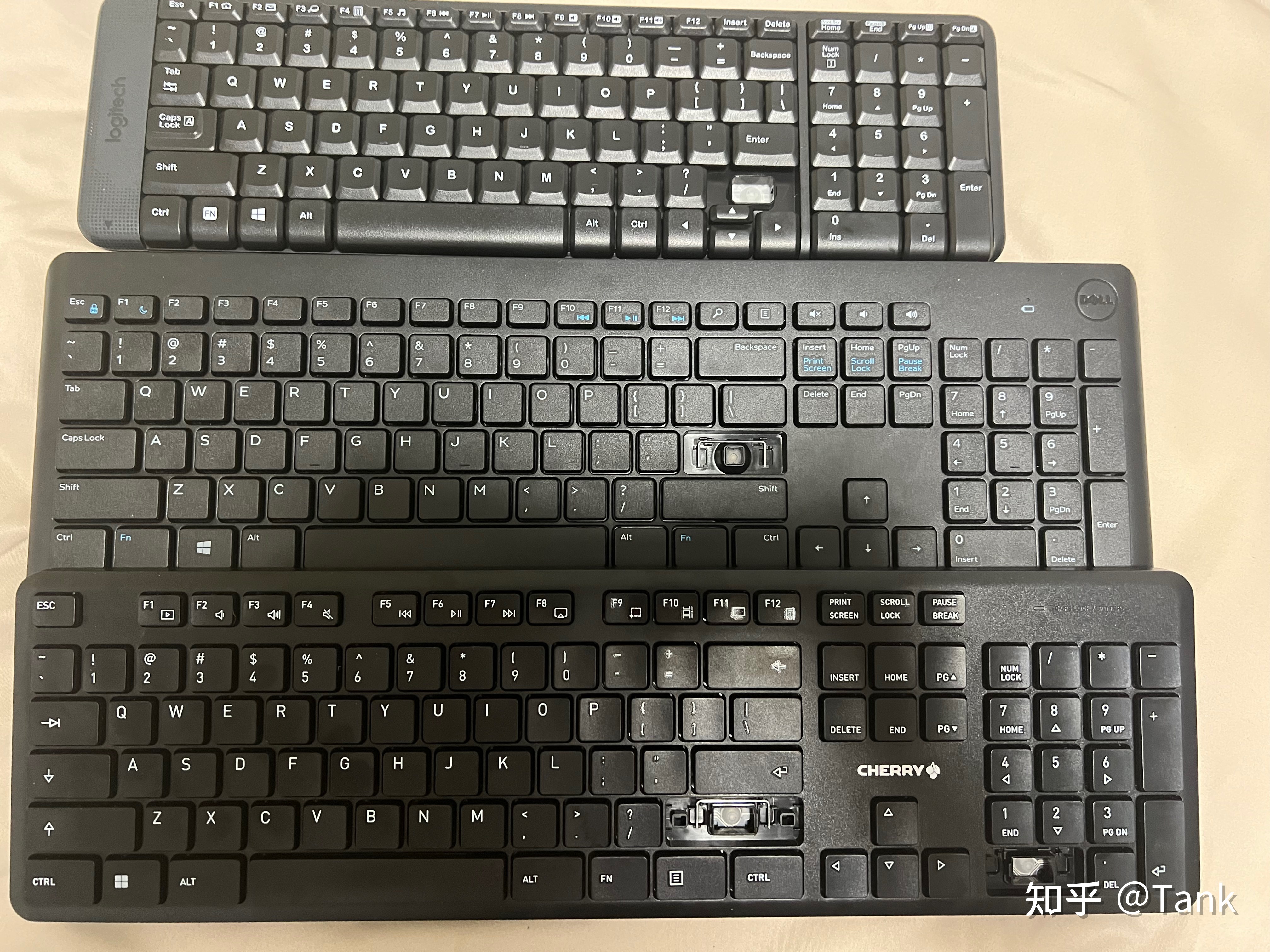 罗技的最小,有点像现在的紧凑配列,键帽四周也有一些弧度,Cherry 和戴尔的键盘键位分布基本一致,也都在右上角留有电量指示灯的设计,这点好评。