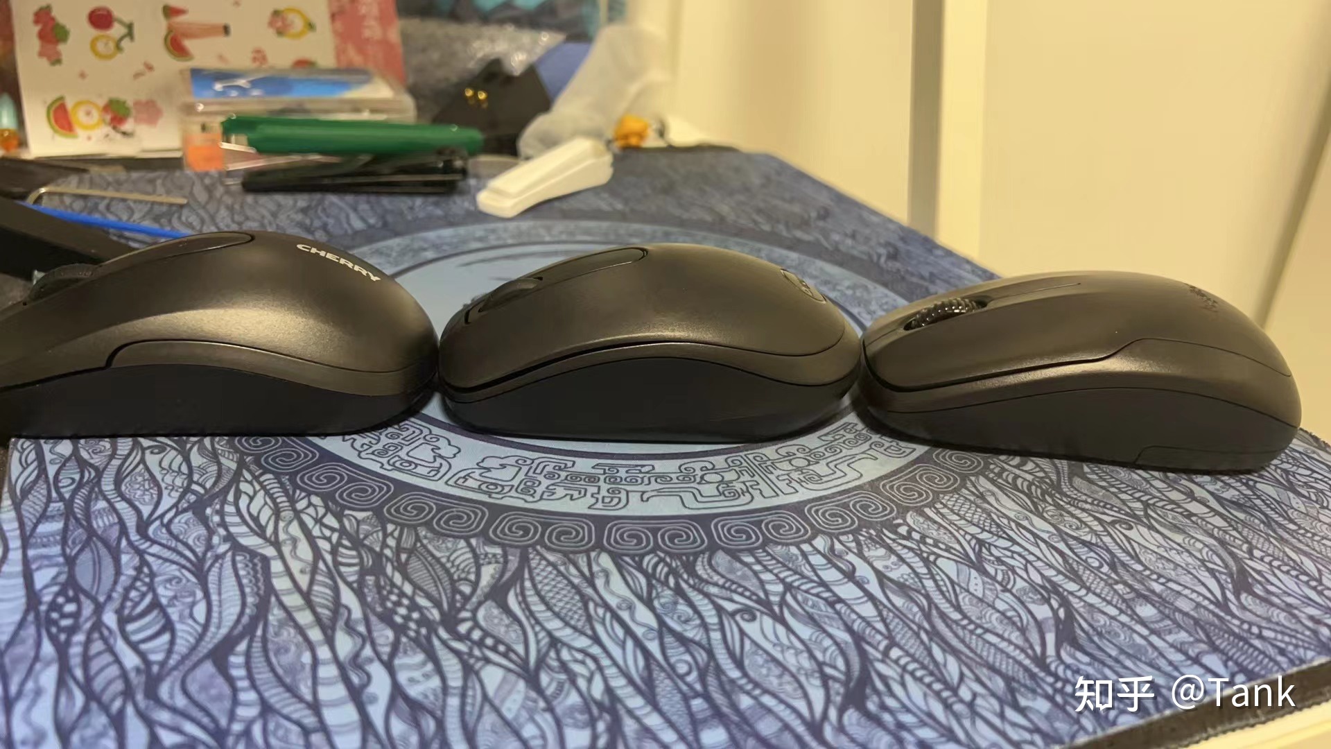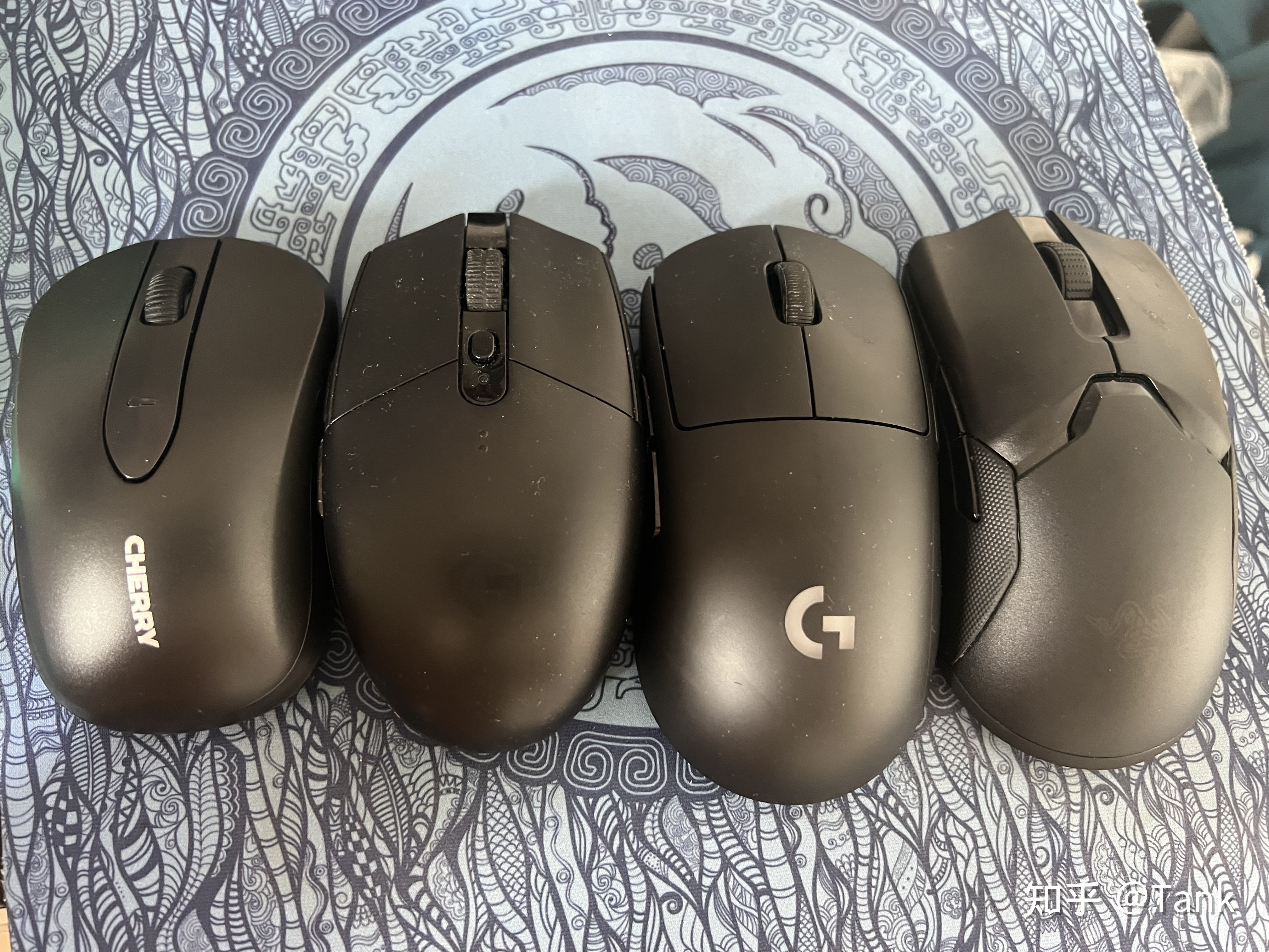 拿鼠标和我常用的几个无线游戏鼠标对比,对称设计的手感还行,我甚至用来打了把 CSGO ,感觉没有影响我的操作。