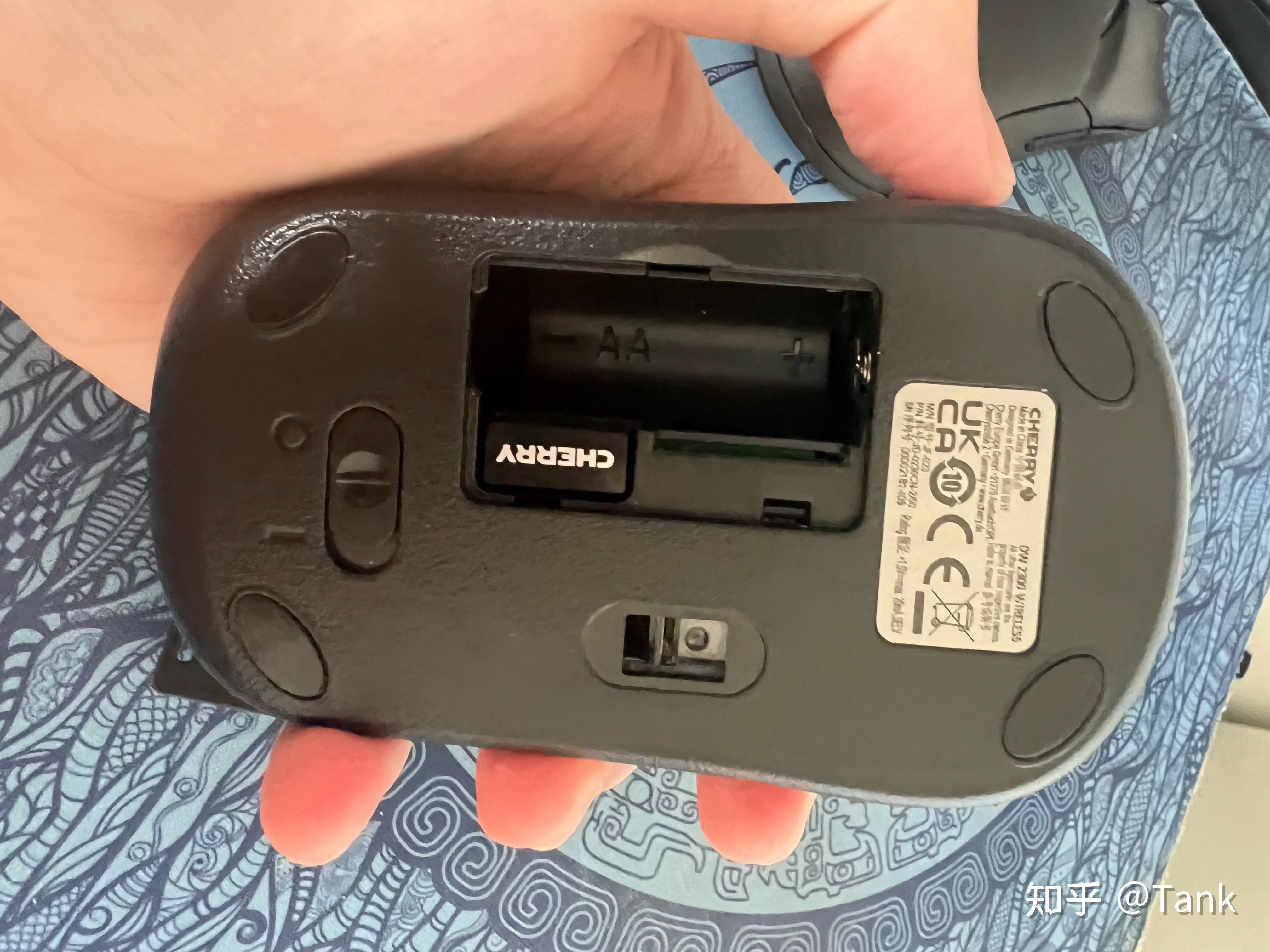 背后有一个很大的电池槽位,而且没有鼠标的开关键,就是插上电池就直接用,也是测评的三款鼠标里唯一一个没有鼠标开关设计的。