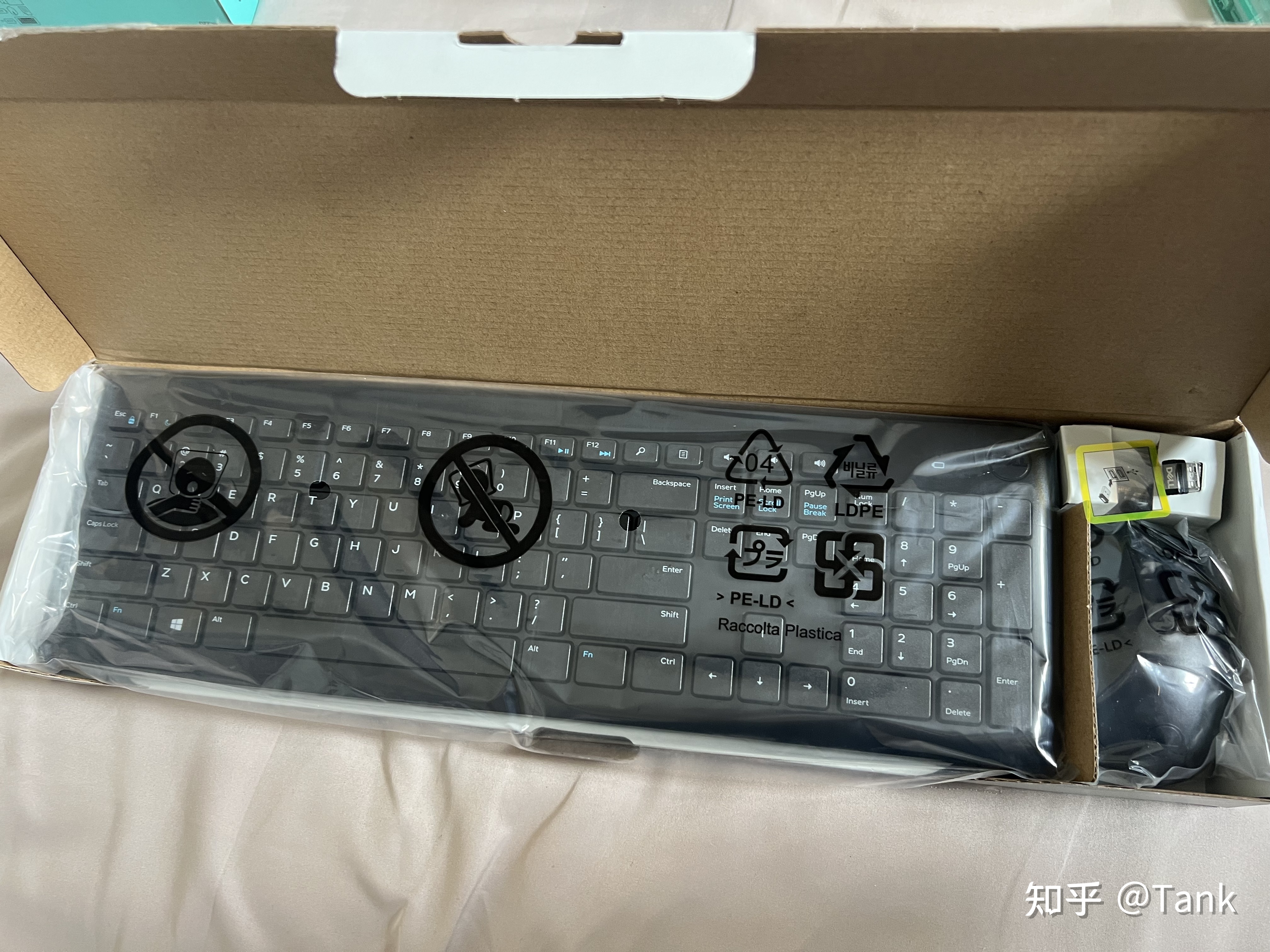 戴尔的键鼠套装使用塑料膜包裹的,无线2.4G和电池在盒子里面插着。