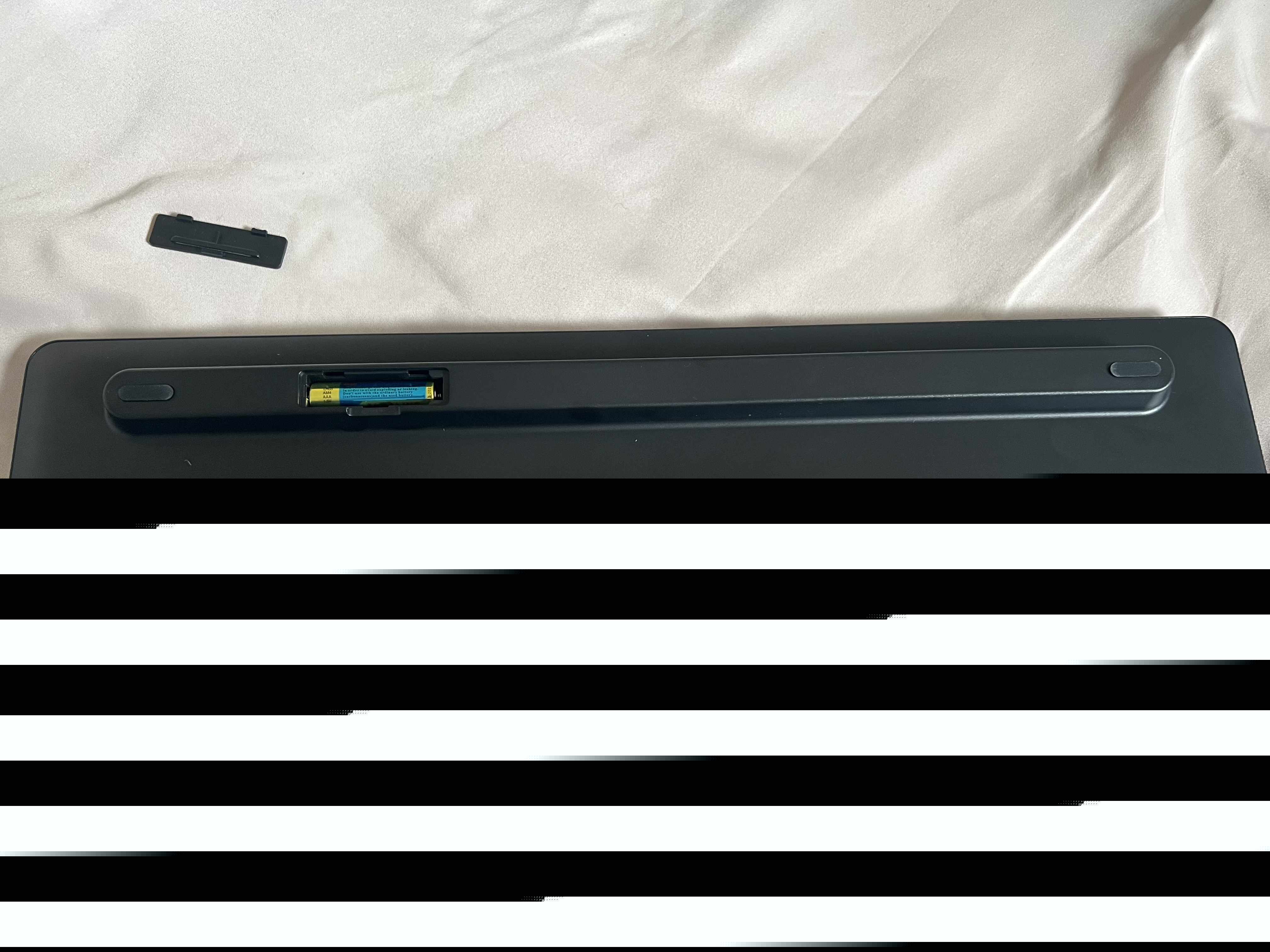 首先先给键盘鼠标都装上干电池,键盘是在背后安装电池的: