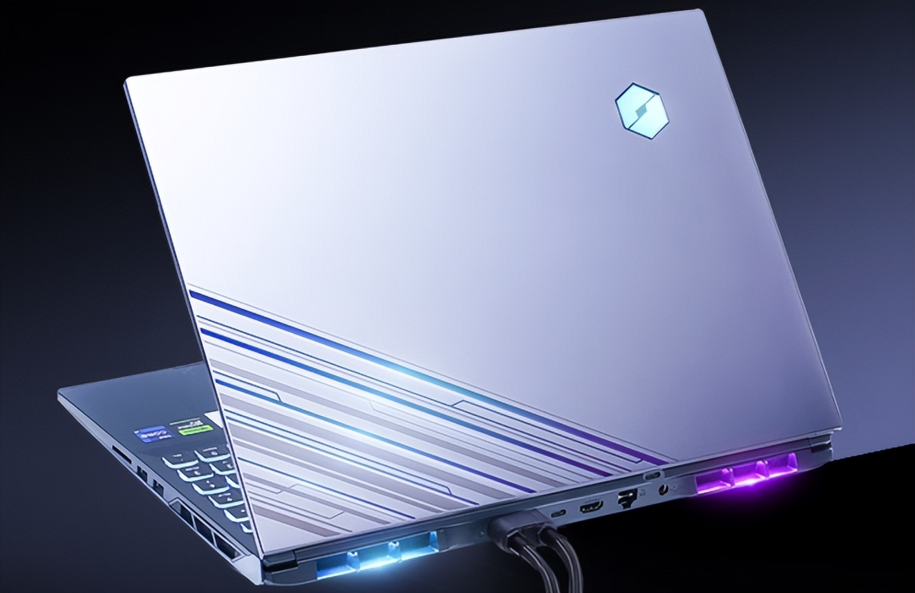 旷世16 Super的A面是金属材质,还加入了比较有特色的炫彩工艺设计,A面的LOGO和出风口带有灯效。机身接口方面,左右两侧各有USB大口,尾部有一个雷电4,视频扩展口为HDMI,值得一提的是,该机还在尾部设置了水冷接口(需单独购买),可以外接机械革命的水冷装置,能进一步提升性能释放、降低风扇噪声,并且效果很明显。