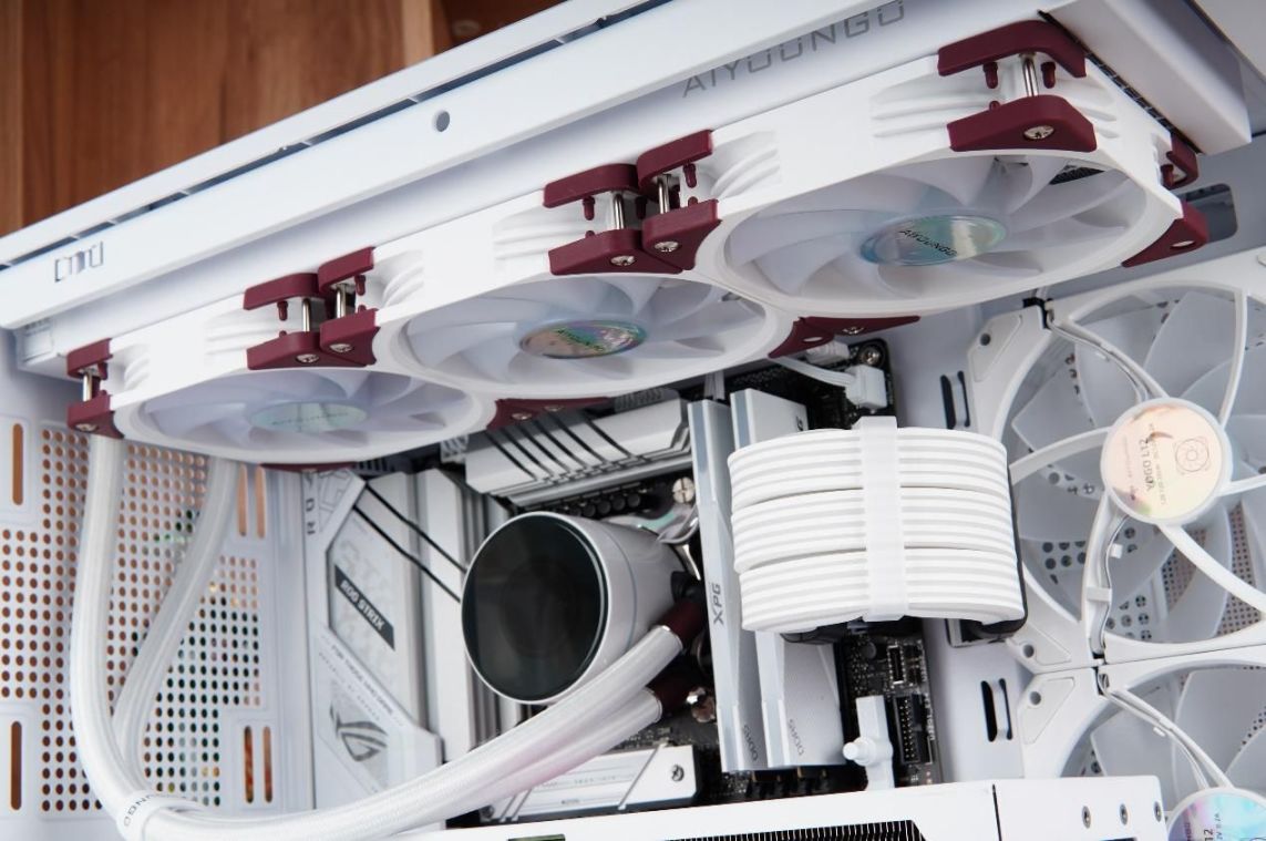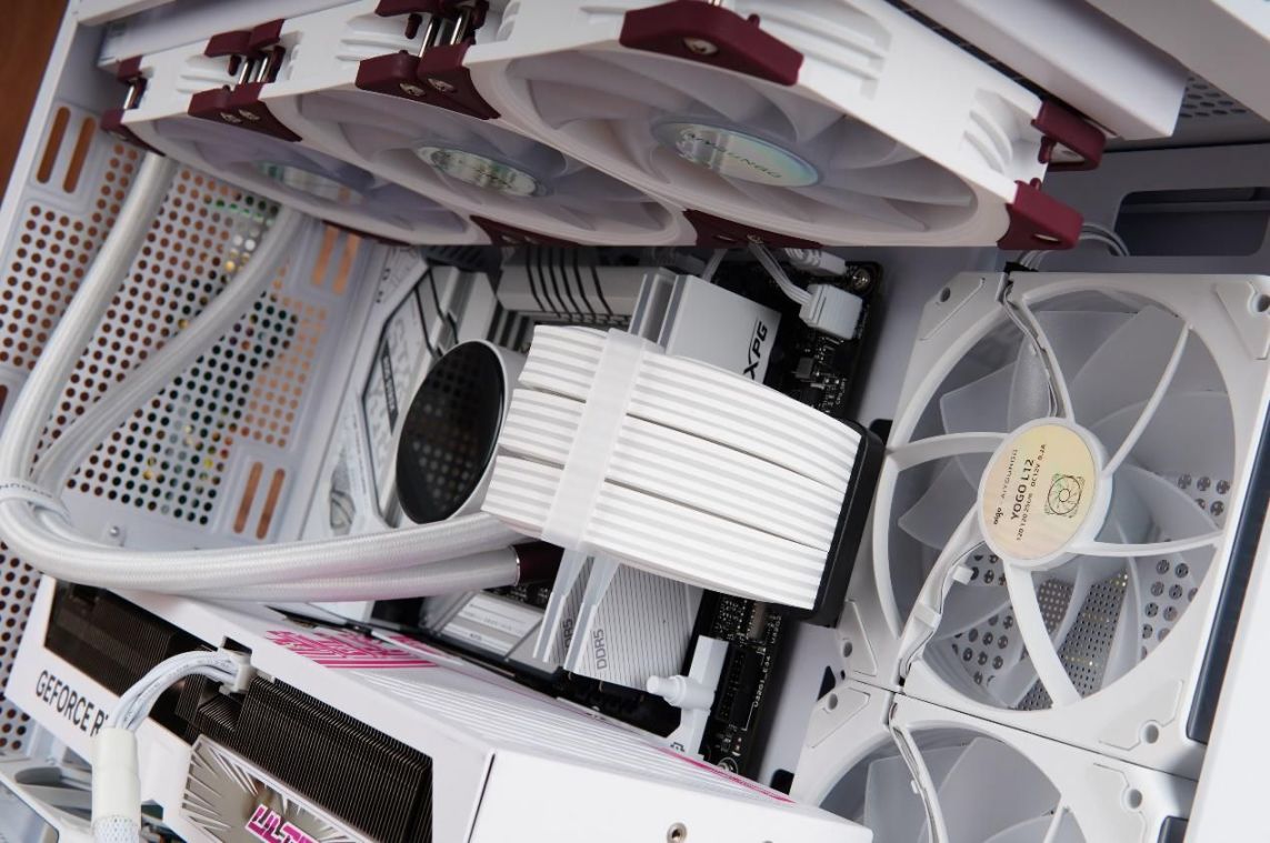 機箱側面的風扇支架以及電源倉上部我都均鋪滿了風扇,以此來加強整機的散熱效能。