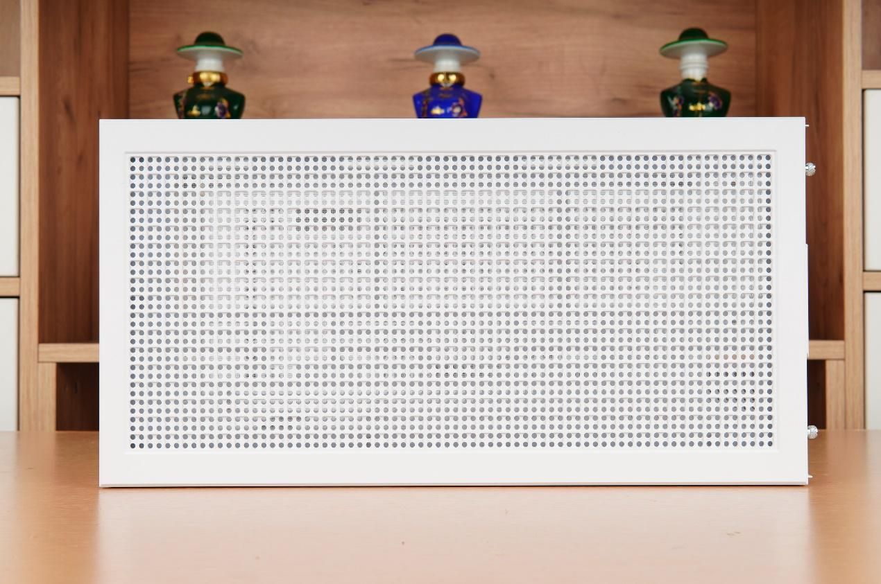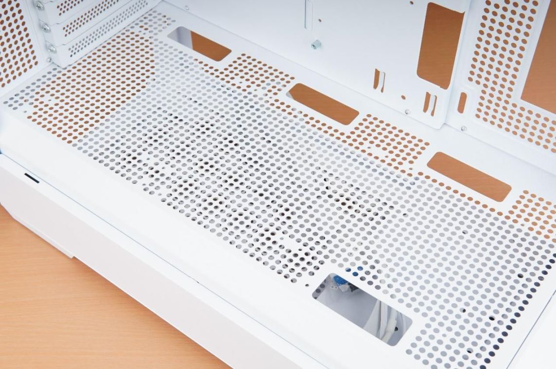 機箱頂部的蓋板通風孔圖案設計非常有意思,首先是分割成許多小正方區域,然後再進行圓形開孔,層次感非常豐富。大概頂部蓋板後即可看到機箱頂部的風扇安裝支架,可以支持360mm規格的一體式水冷安裝。