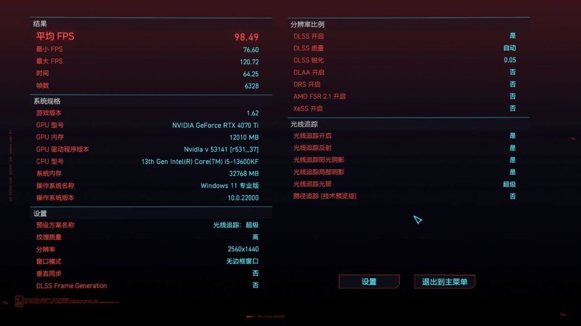 賽博朋克2077,開啓預設超級光線追蹤,開啓DLSS自動,平均FPS達到98.49。