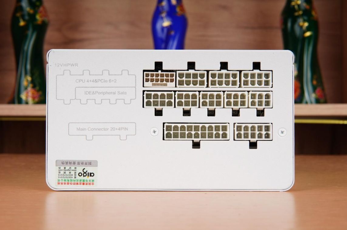 由於內部的方案升級至ATX3.0版本,因此在電源的模組接口處可以看到一個原生的12VHPWR接口。